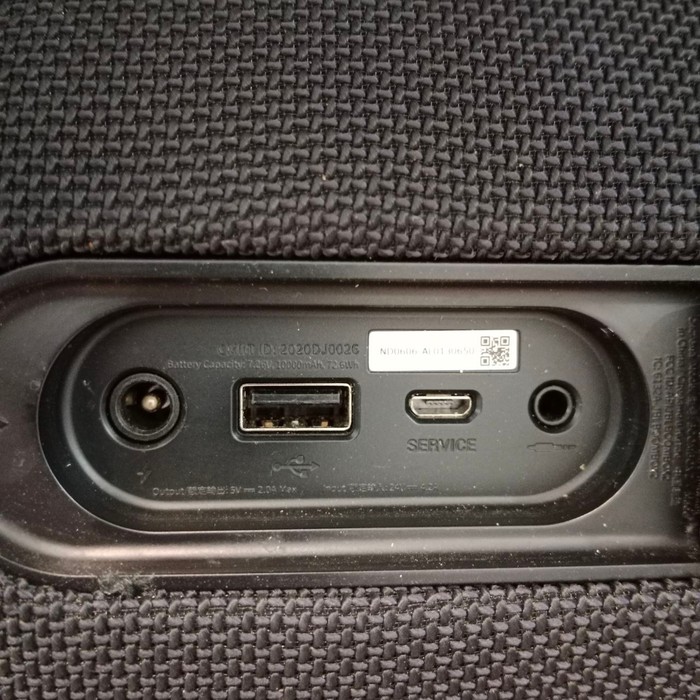 Разъёмы: для зарядки колонки и смартфонов, для сервисного подключения и AUX-разъём.