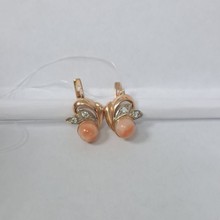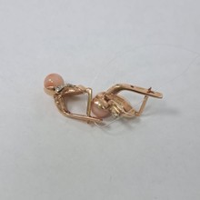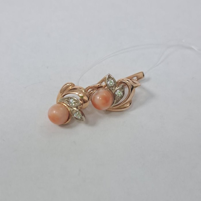 Серьги женские; английская застежка.Вставка: Персиковый коралл, цвет вставки персиковый, белый, кол-во вставок 6шт.Цвет металла красный